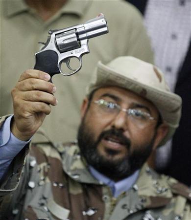 وقال الشيباني لمؤتمر صحفي عقد في مصراتة يوم الاحد انه عندما القي القبض عليه كان القذافي مسلحا بمسدس ماجنوم 357 سميث اند وسن محشو بطلقات دمدم المحظور طبقا للمعاهدات الدولية ومسدس براوننج مطلي بالذهب في خاصره وبندقتين هجوميتين بالقرب منه.