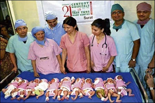 وضعت سيدة هندية 11 مولودا في حالة تعد الأغرب من نوعها على مستوى العالم ، الأمر الذي لم يثر انبهار مجموعة الأطباء وطاقم التمريض ،في المستشفى الذين قاموا بتوليدها فحسب ، بل أثار انبهار العالم أجمع.